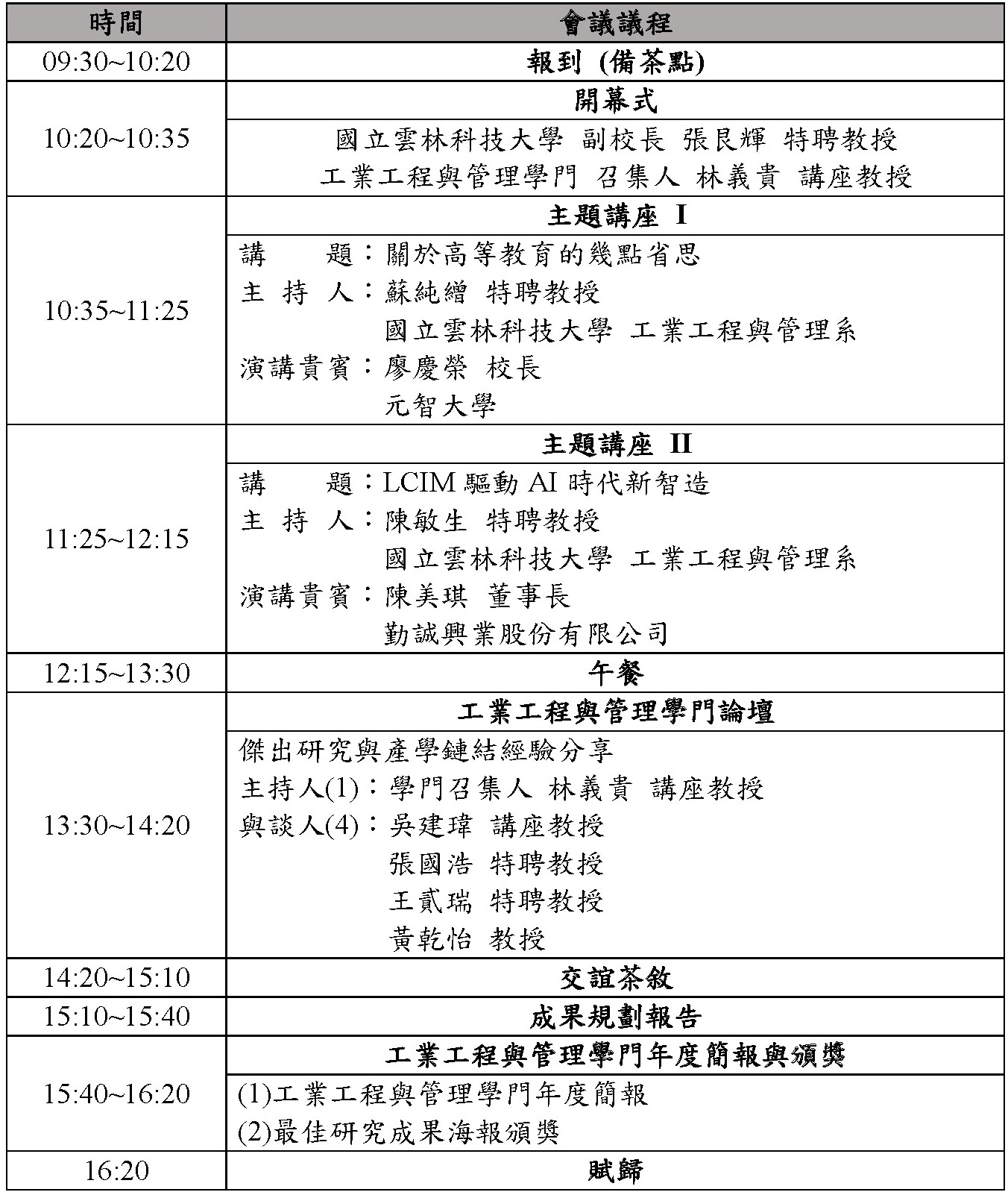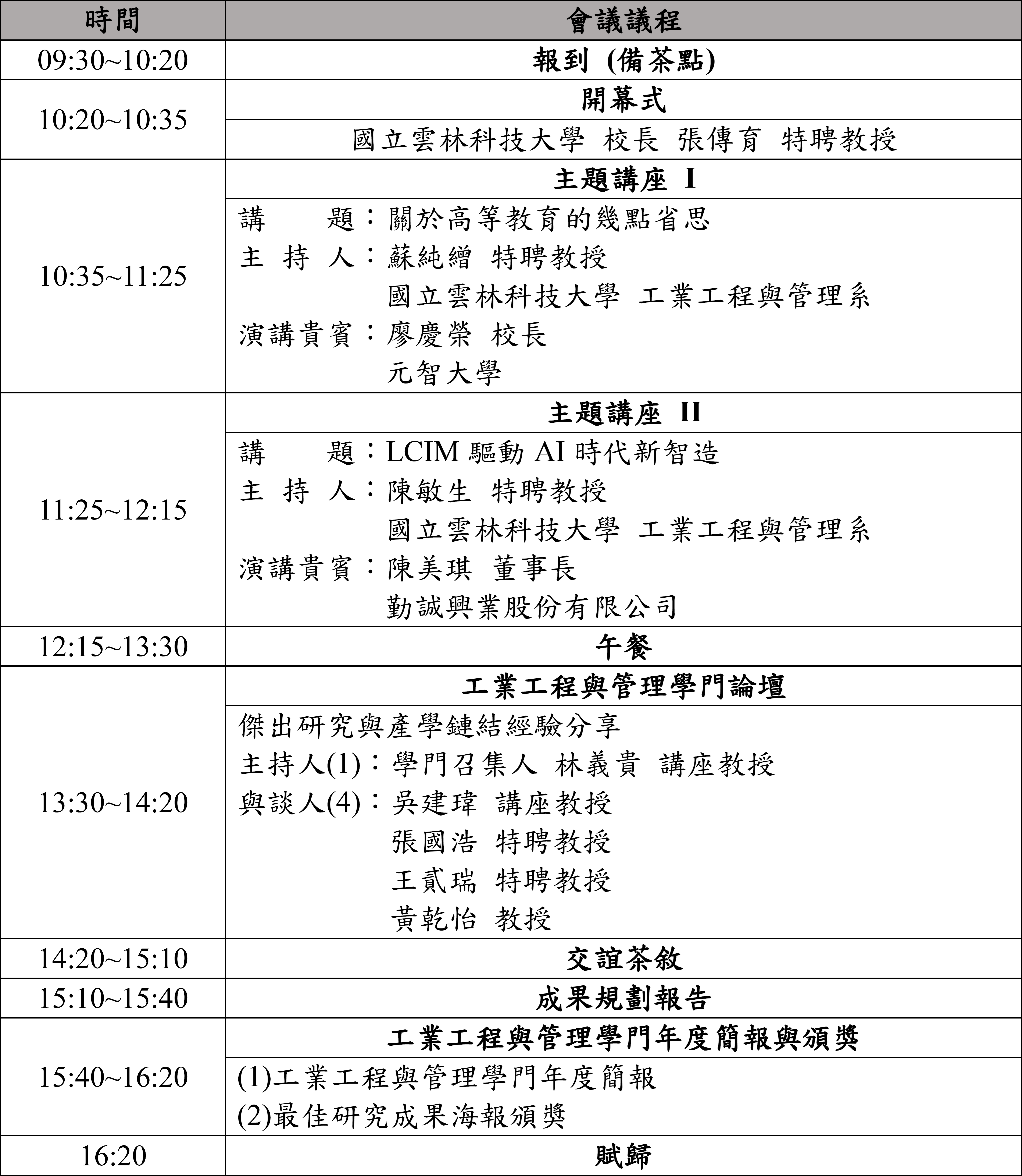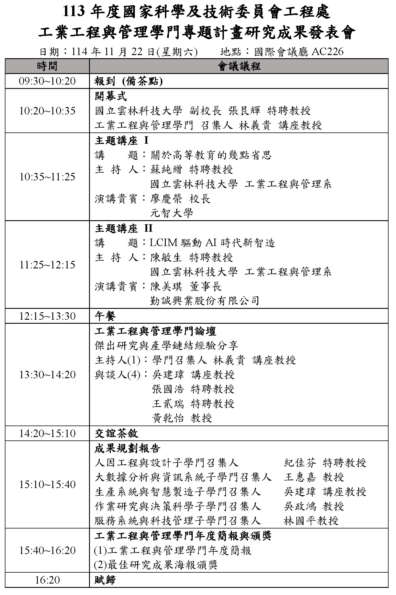 本年度工業工程與管理學門成果發表會將於11/22(六)由國立雲林科技大學工業工程與管理系舉辦。主要目的在於促進產學專家之交流,深入探討工業工程與管理重要議題。會議亦安排工業工程與管理學門的學者專家對工業工程與管理相關領域之研究成果及國內重要議題進行心得分享與專業交流,期能增進專題計畫研發成效與擴展產學計畫的廣度。