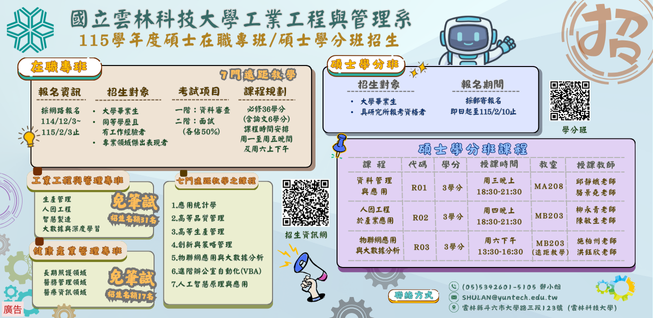 | 12/06 | 徵才 | 國立雲林科技大學工業工程與管理系 誠徵專案師資公告 |