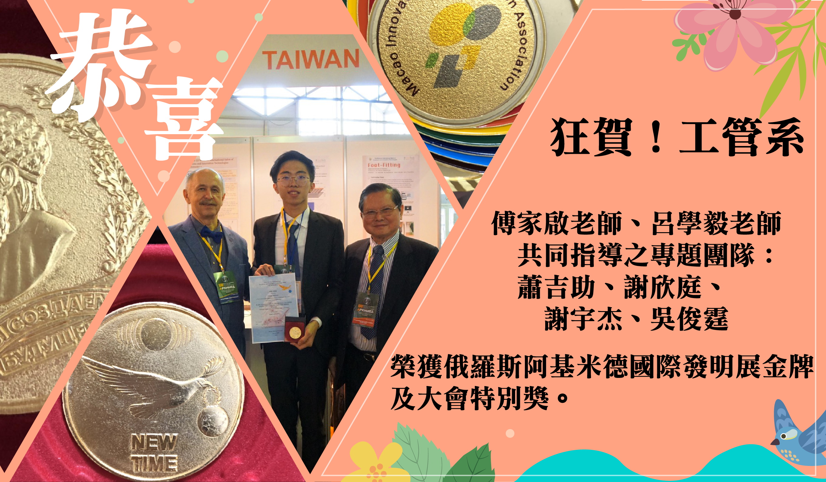狂賀!傅家啟老師、呂學毅老師指導之專題團隊榮獲俄羅斯阿基米德國際發明展金牌及大會特別獎 發布人: 吳瑾 發布時間: 2019-04-01 15:16:46 點閱率: 1514 狂賀! 工管系傅家啟老師、呂學毅老師共同指導之專題團隊: 蕭吉助同學、謝欣庭同學、謝宇杰同學及吳俊霆同學 共同研發之「履適步爽Foot-Fitting系統」 榮獲俄羅斯阿基米德國際發明展金牌及大會特別獎。 相關新聞報導: ETTODAY新聞雲 聯合新聞網 蘋果新聞 雅虎新聞 俄羅斯-01.png 2.70MB