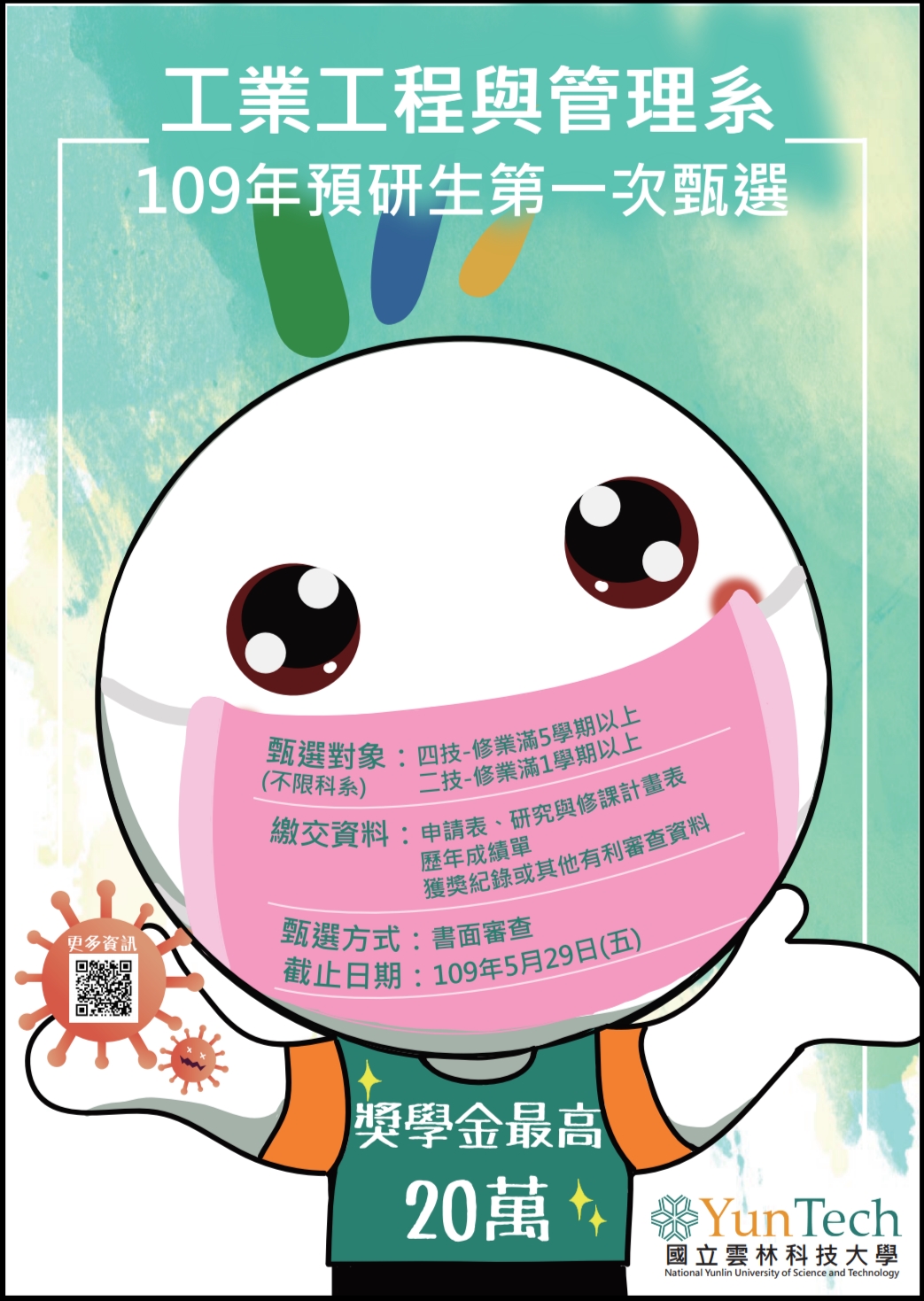 - 申請文件請於109年5月29日(五)下午5時前送至工管系辦公室(MA202),逾時不候。