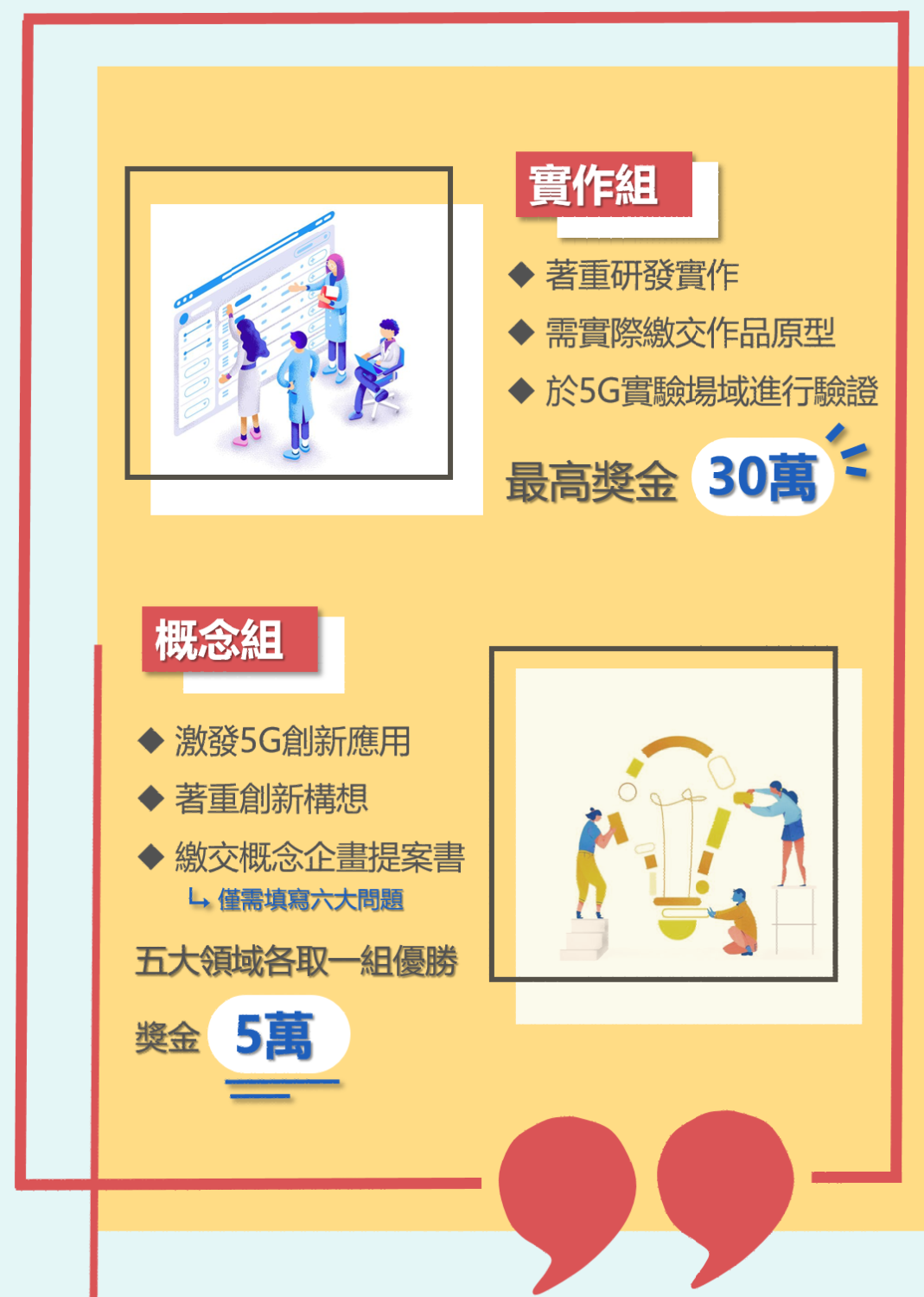 概念組需提供概念提案,以創新創意為主要訴求,回答六道問題即可參與,最高獎金5萬元。
