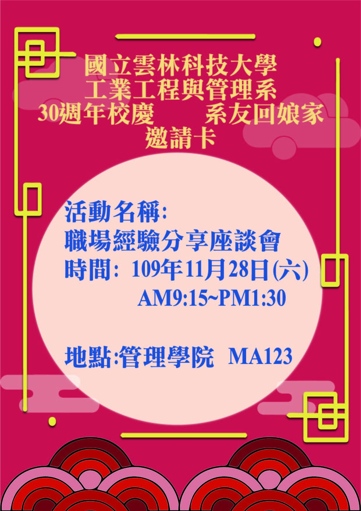 敬邀工管系系友參加30周年校慶! 發布人: 吳瑾 發布時間: 2020-11-04 10:43:03 點閱率: 1074 狂賀、狂賀~~30周年校慶~!!! 系辦今年特別邀請傑出畢業系友為大家進行職場經驗分享, 並於中午時段安排輕鬆茶會與師生交流, 歡迎系友們攜家帶眷,返校學弟妹分享職場的點滴趣事! 「報名網址」https://forms.gle/arCJV8o17gN8e1WE7 4_3.jpg 866.07KB