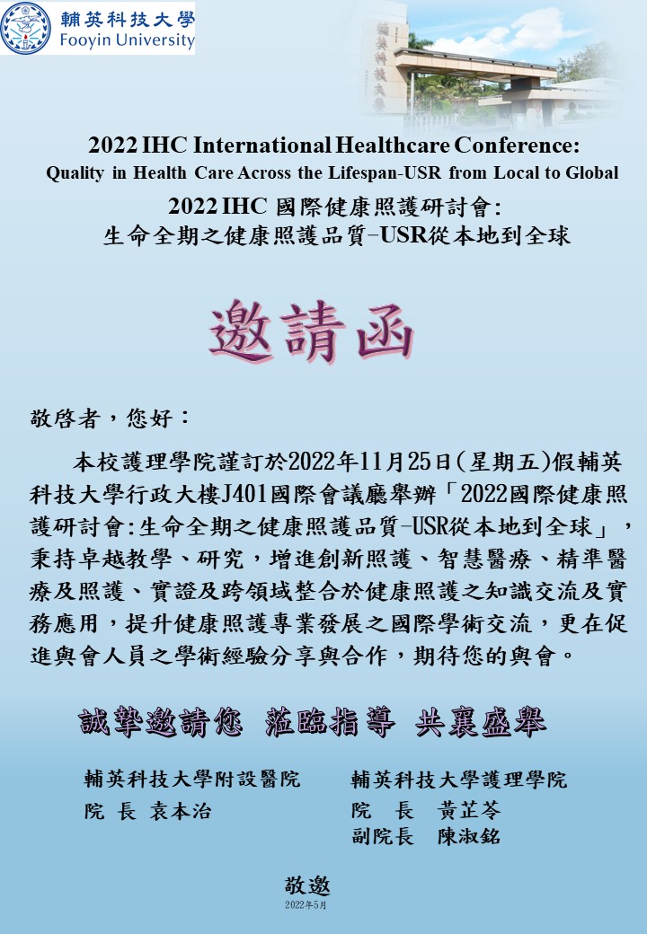輔英科技大學附設醫院舉辦2022International Healthcare Conference 國際健康照護研討會 發布人: 林雅婷 發布時間: 2022-05-24 15:33:21 點閱率: 508 請參考附件說明 輔英科技大學附設醫院函.pdf 82.24KB 輔英科技大學附設醫院附件1.JPG 183.35KB 輔英科技大學附設醫院附件2.JPG 275.20KB