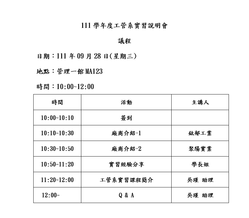 111學期實習說明會將於09/28(三)舉辦