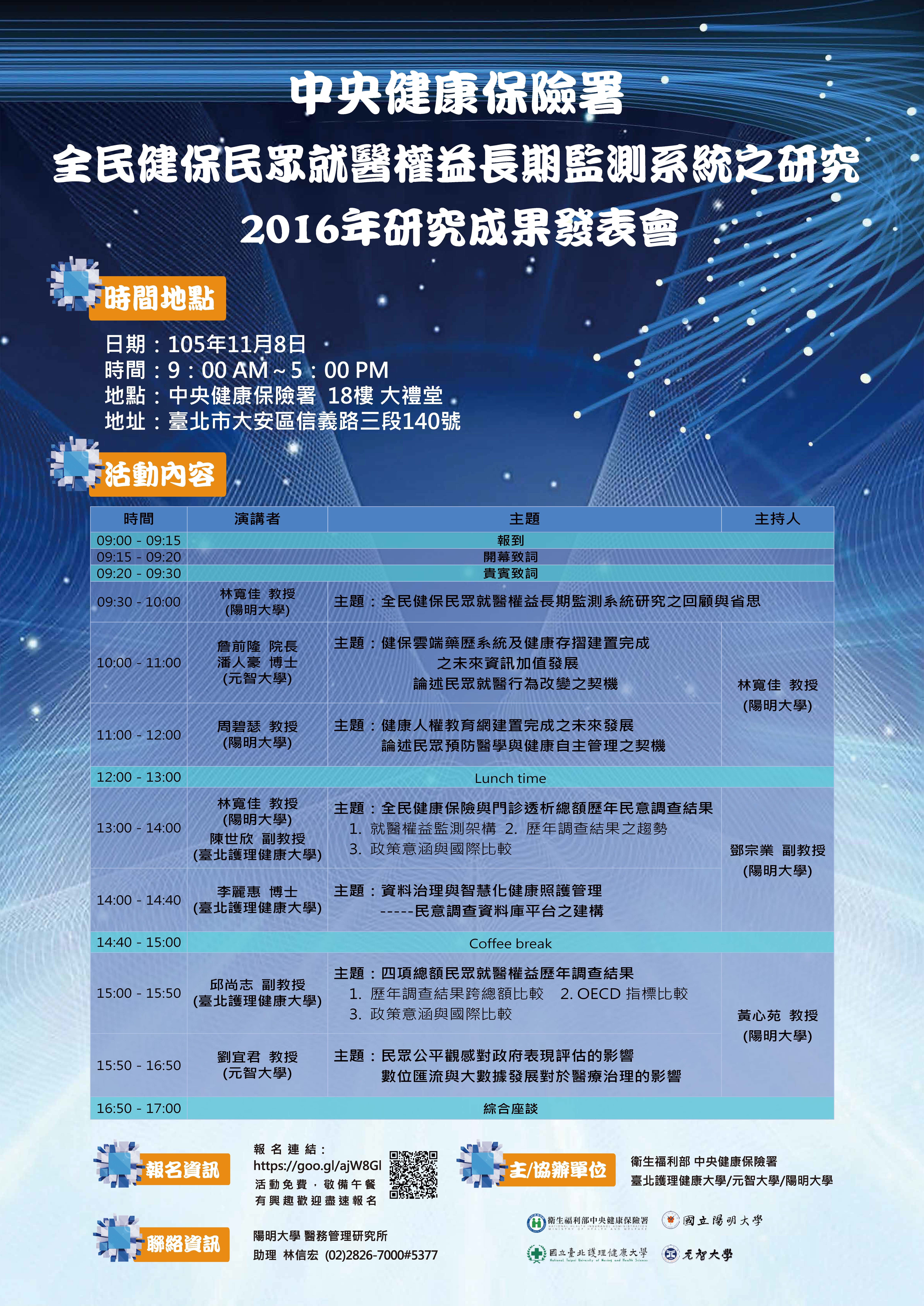 臺北護理健康大學105.11.8辦理「全民健保民眾就醫權益長期監測系統之研究2016年研究成果發表會」